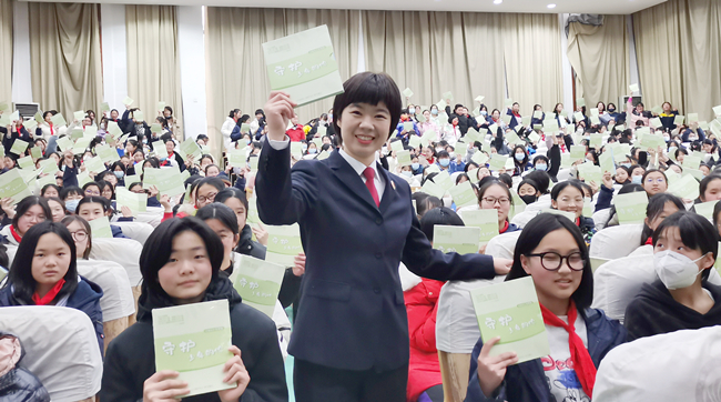 杨帅在江苏省无锡市某中学开展“防性侵”法治宣讲,并发放《守护少年的你》法治教育读本(初中版)。
