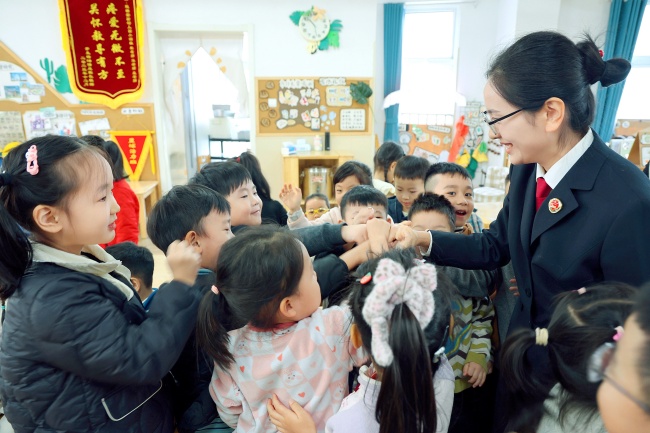 11月4日,江苏省徐州市鼓楼区检察院检察官走进该区某幼儿园,通过趣味问答、情景“过家家”等形式,与小朋友们做起防拐骗、守私密、保安全的系列自我保护游戏,共同以画笔讲故事,畅想“长大后的梦想”,在寓教于乐中以法治温暖护航童年成长。本报记者管莹 通讯员金磊 李雅婷摄
