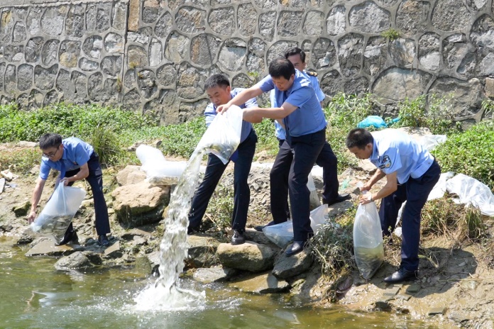近日,湖北省宜昌市夷陵区检察院联合该区法院、区公安分局、区综合行政执法局等单位开展生态修复增殖放流活动,在黄柏河人寿桥段放流鱼苗万余尾。据了解,本次活动购买鱼苗的资金来源于该院办理的3起非法捕捞水产品案件当事人所缴纳的生态环境损害赔偿金。本报记者蒋长顺 通讯员何骁摄
